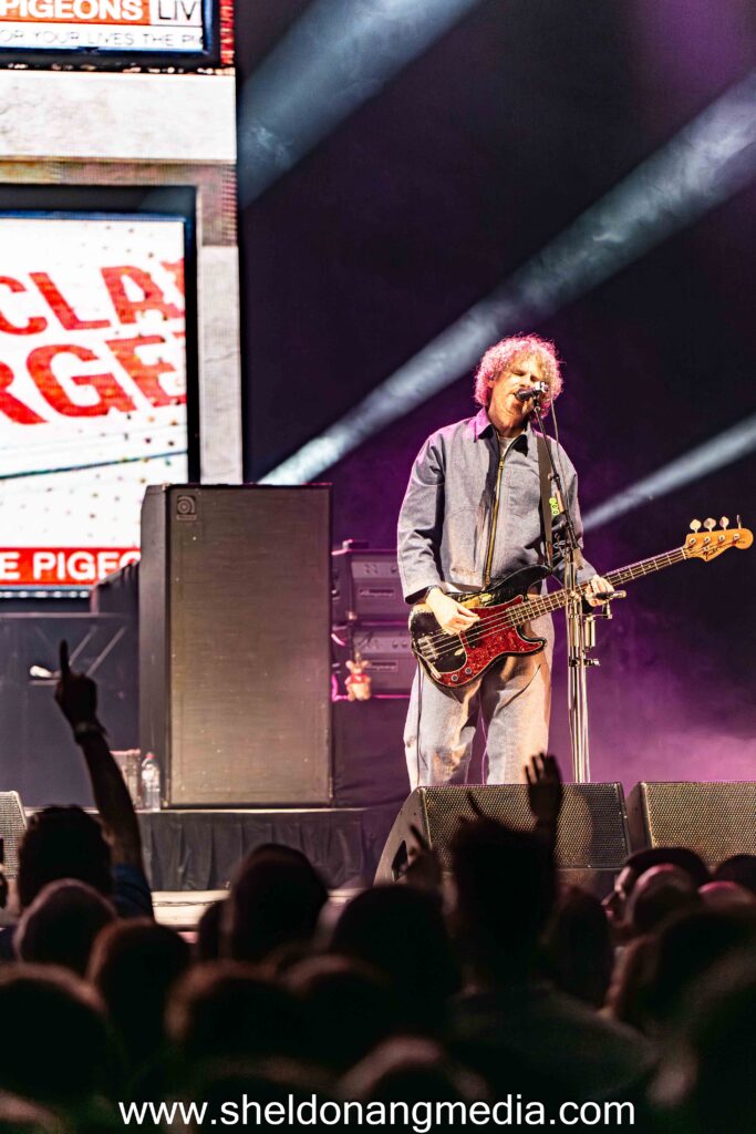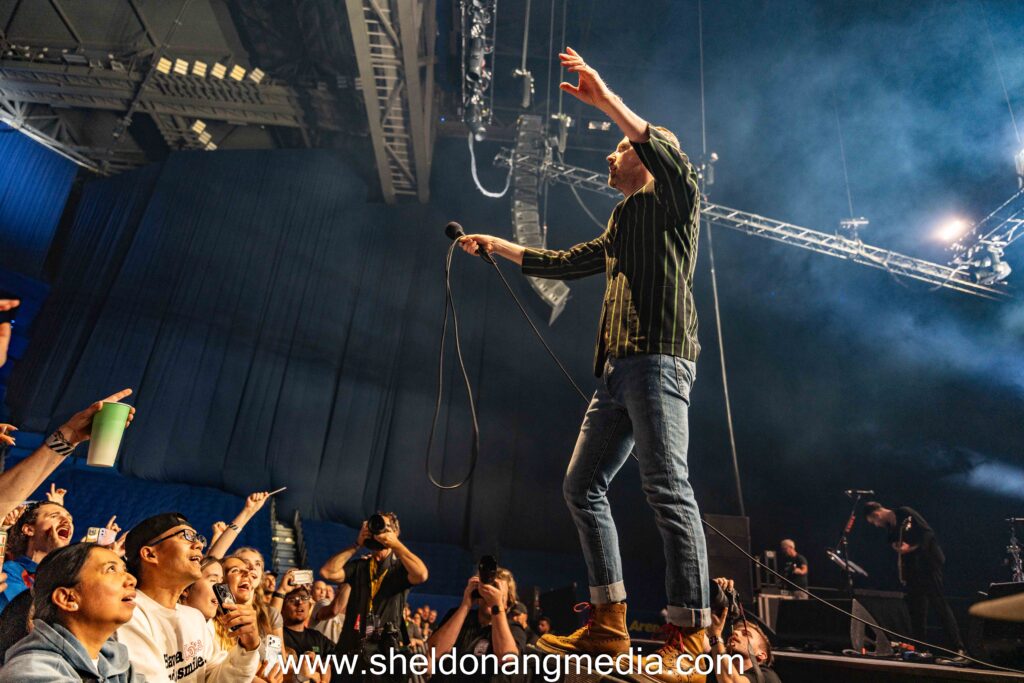 When the lights dimmed and the opening riff of Everyday I Love You Less and Less rang out, the crowd erupted. As for this first timer and for many in the crowd, we were drawn by the lead vocalist, Ricky Wilson, a frontman who refused to stand still. He was mesmerising and captivating thanks to his on-stage shenanigans. He zipped across the stage in a three-dimensional spectacular. By the second track in I Predict a Riot, he was jumping as if he had ants in his pants, and swinging his wired mic like how an ’80s rockstar would in the heydays of rock. His energy, playful banter, and ability to orchestrate sing-alongs and engage the crowd transformed the arena into an English drunken kareoke experience, and with the intimate setting, everyone felt the proximity. And there were plenty of sing-alongs. He grinned and occasionally hand-punched in the air like the late Freddie and sometimes stretched his arms like the Christ the Redeemer while standing high at the edge of the platform.