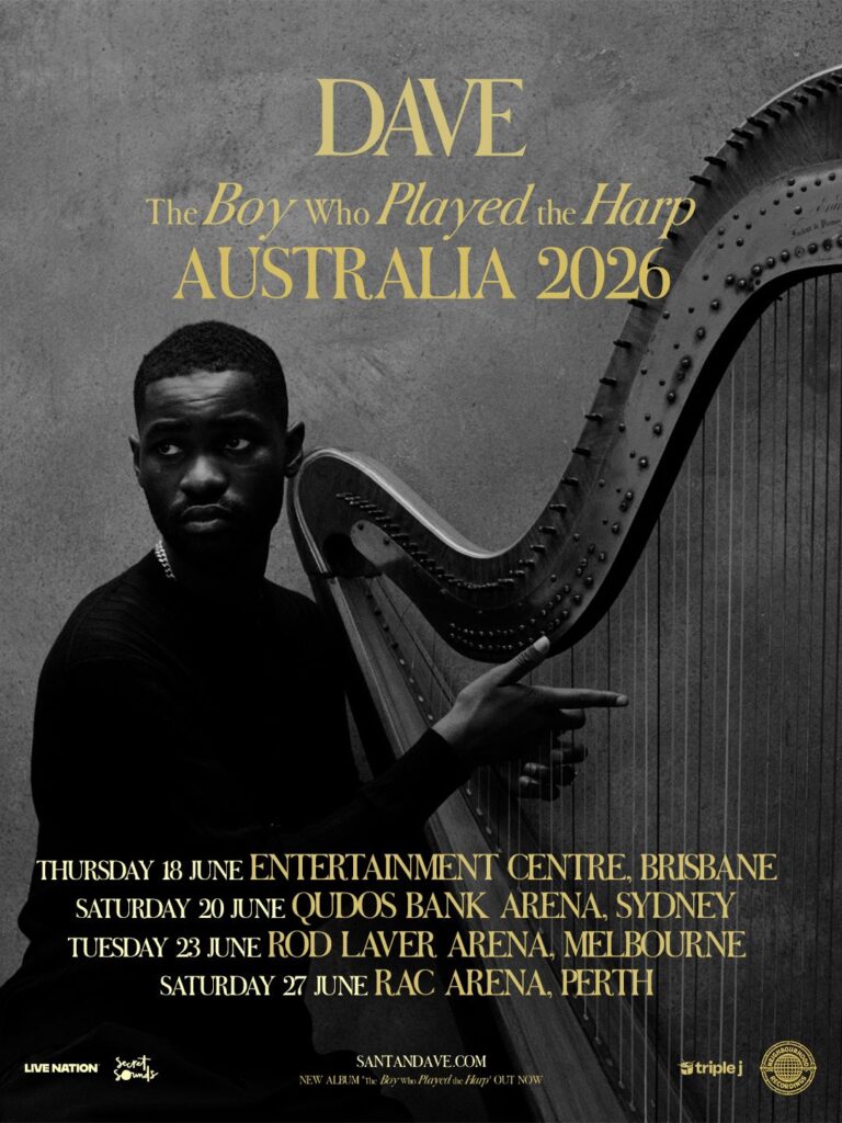 The tour follows the release of The Boy Who Played the Harp, Dave’s first new project since 2023. That year, his self-produced Central Cee collaboration “Sprinter” became the first UK rap single to debut at #1 on the Australian chart, where it remained for seven weeks. His latest single, “Raindance”, featuring Tems, looks set to join “Sprinter”, “Location” and “Clash” in achieving platinum status in Australia.