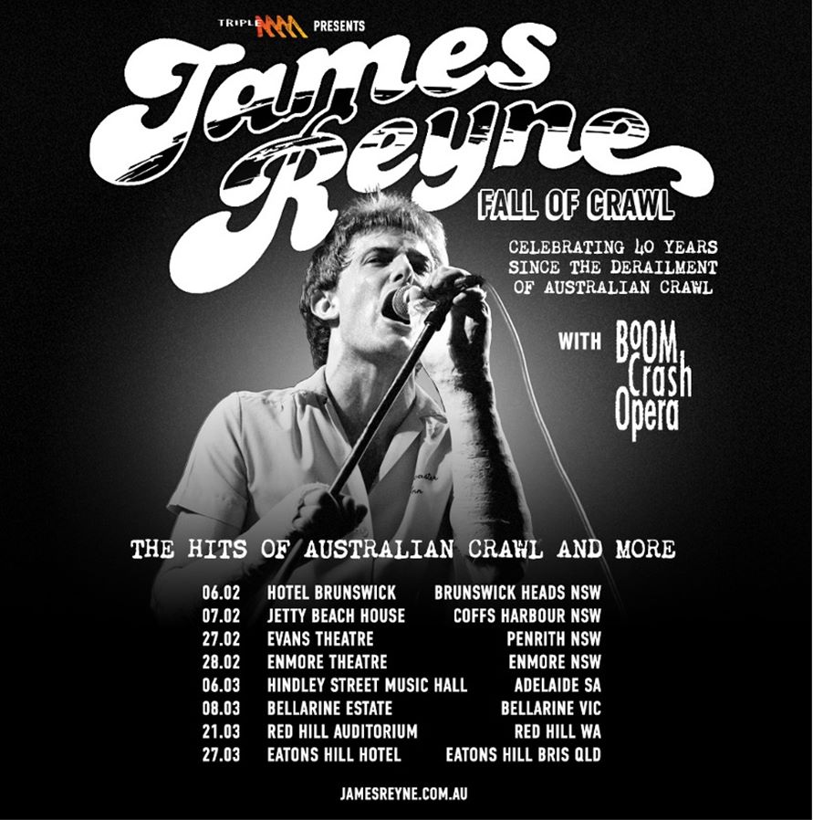 Next year, 2026, James Reyne will celebrate The Fall Of Crawl, taking the songs out for a COMMEMORATIVE run around the country. Taking in a vast array of locations, from Brunswick Heads to Coffs Harbour, Penrith to Sydney, Adelaide, Bellarine, Red Hill and Brisbane.