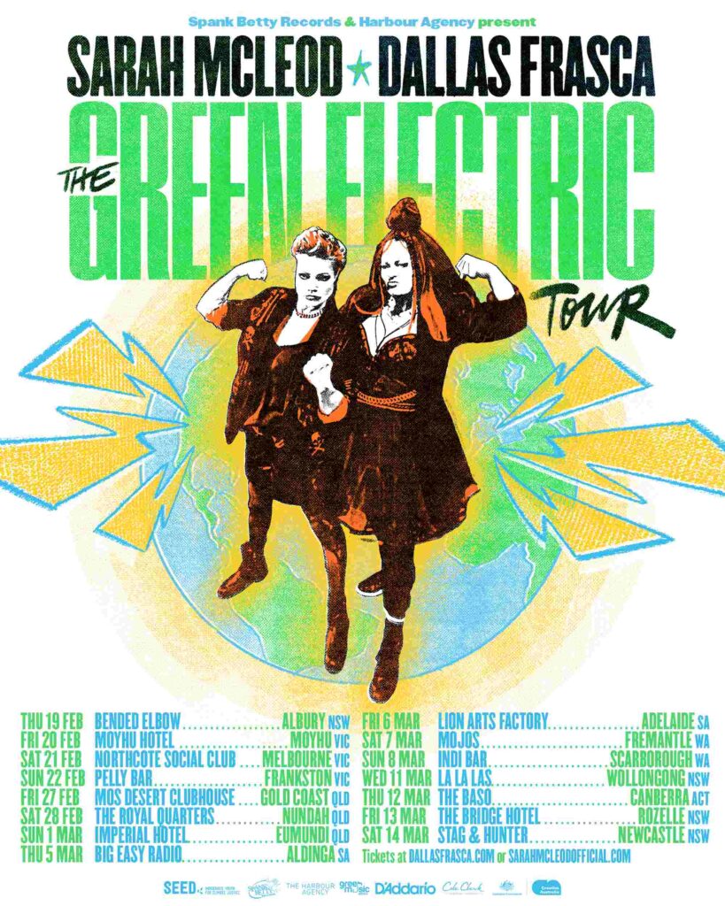The GREEN ELECTRIC TOUR represents both McLeod and Frasca’s ongoing commitment to sustainability; more specifically, sustainable touring. Teaming up with Green Music Australia to green the tour, Sarah and Dallas have added a small levy to fund measurable sustainable touring actions, with the tour proudly supported by Music Australia, The Harbour Agency, and Spank Betty Records; the tour also supports Seed Mob, Australia’s first Indigenous youth-led climate justice organisation in their ongoing fight for climate justice.